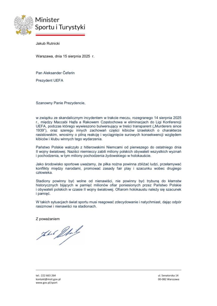 Nie ma naszej zgody na zakłamywanie historii i hańbienie polskich barw narodowych. Skandaliczne zachowanie kibiców izraelskiego klubu musi być natychmiast napiętnowane i potępione – dlatego minister sportu i turystyki Jakub Rutnicki kieruje pismo do Prezydenta UEFA. Wnosimy o pilną reakcję i wyciągnięcie surowych kar.