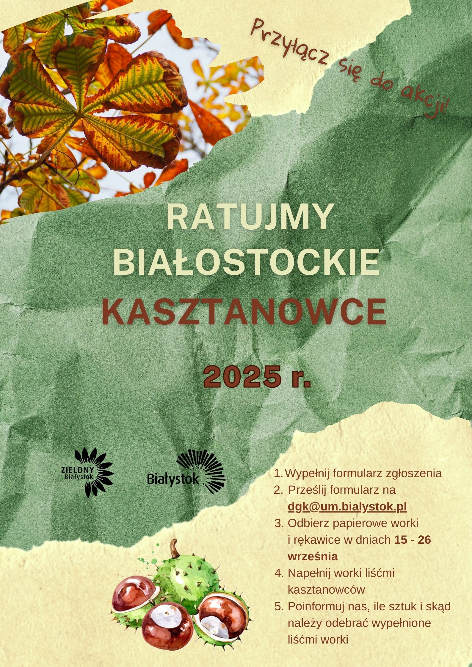 Białystok już po raz dwudziesty pierwszy rusza z jesienną akcją „Ratujmy białostockie kasztanowce”. To coroczna inicjatywa, dzięki której mieszkańcy pomagają chronić drzewa przed szkodnikiem – szrotówkiem kasztanowcowiaczkiem. To właśnie on sprawia, że liście brązowieją i opadają za wcześnie, a drzewa stają się coraz słabsze. Akcja, skierowana zarówno do placówek oświatowych, jak i wszystkich mieszkańców, potrwa do 3 listopada.