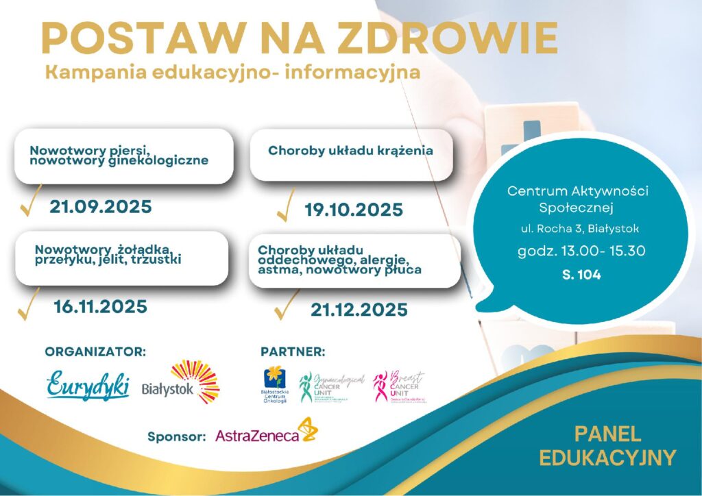 Po raz kolejny można wziąć udział w wyjątkowych spotkaniach z ekspertami z dziedziny ginekologii onkologicznej oraz nowotworów piersi. Miasto Białystok wraz ze Stowarzyszeniem Eurydyki kontynuuje kampanię informacyjno-edukacyjną „Postaw na zdrowie”. Wydarzenie objęte jest Patronatem Prezydenta Miasta Białegostoku.