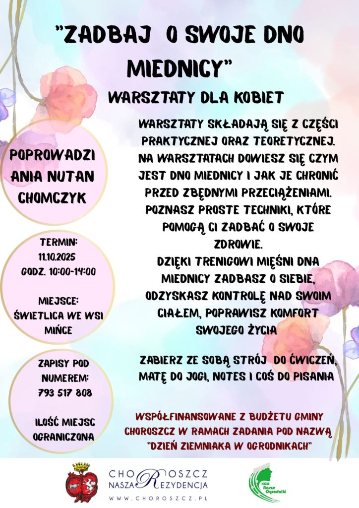 Koło Gospodyń Wiejskich „Nasze Ogrodniki” zaprasza na wyjątkowe warsztaty dla kobiet pt. „Zadbaj o swoje dno miednicy”. To doskonała okazja, by poznać proste techniki i zdobyć wiedzę, która pomoże chronić się przed zbędnymi przeciążeniami i poprawić komfort życia.