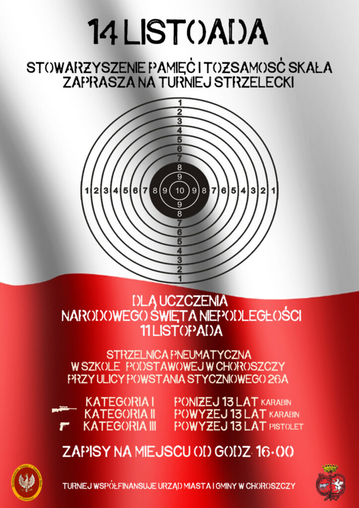 Na Strzelnicy Pneumatycznej prowadzonej przez Stowarzyszenie Pamięć i Tożsamość „Skała” znajdującej się w Szkole Podstawowej w Choroszczy odbędą się zawody strzeleckie z okazji Narodowego Święta Niepodległości.